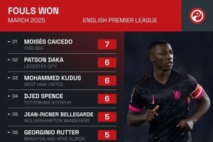英超3月制造犯规次数榜:凯塞多7次居首,库杜斯6次&特罗萨德5次